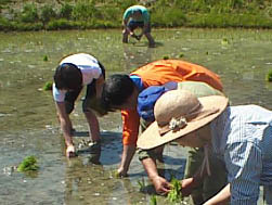 晴天に恵まれ大人も子供も裸足になって約2時間かけて五百万石の田植えを行いました。